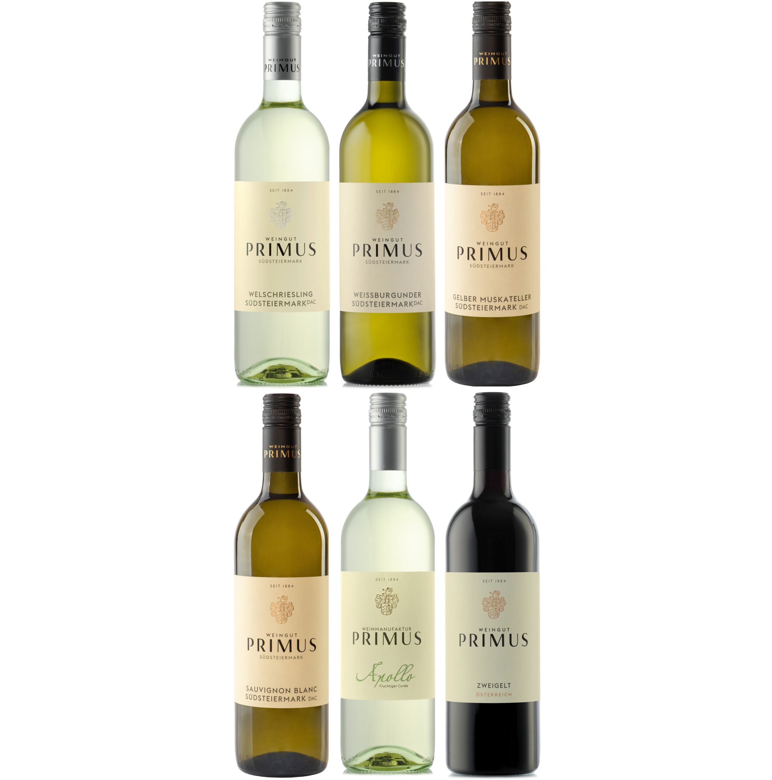 6 x 0,75, jeweils eine Flasche: Welschriesling, Sauvignon Blanc, Weissburgunder, Gelber Muskateller, Zweigelt und unser slowenischer Cuvée APOLLO.